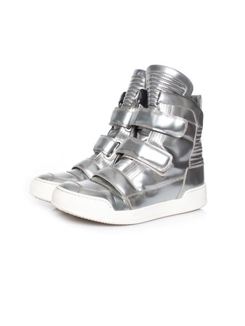 Balmain, metallic hoge sneakers met dubbel klitteband. Deze sneakers hebben dubbel bandjes en een rubberen zool. Een keer gedragen en in goede staat, heeft een kras op de rechterschoen. Komt met de originele stofzak en doos.