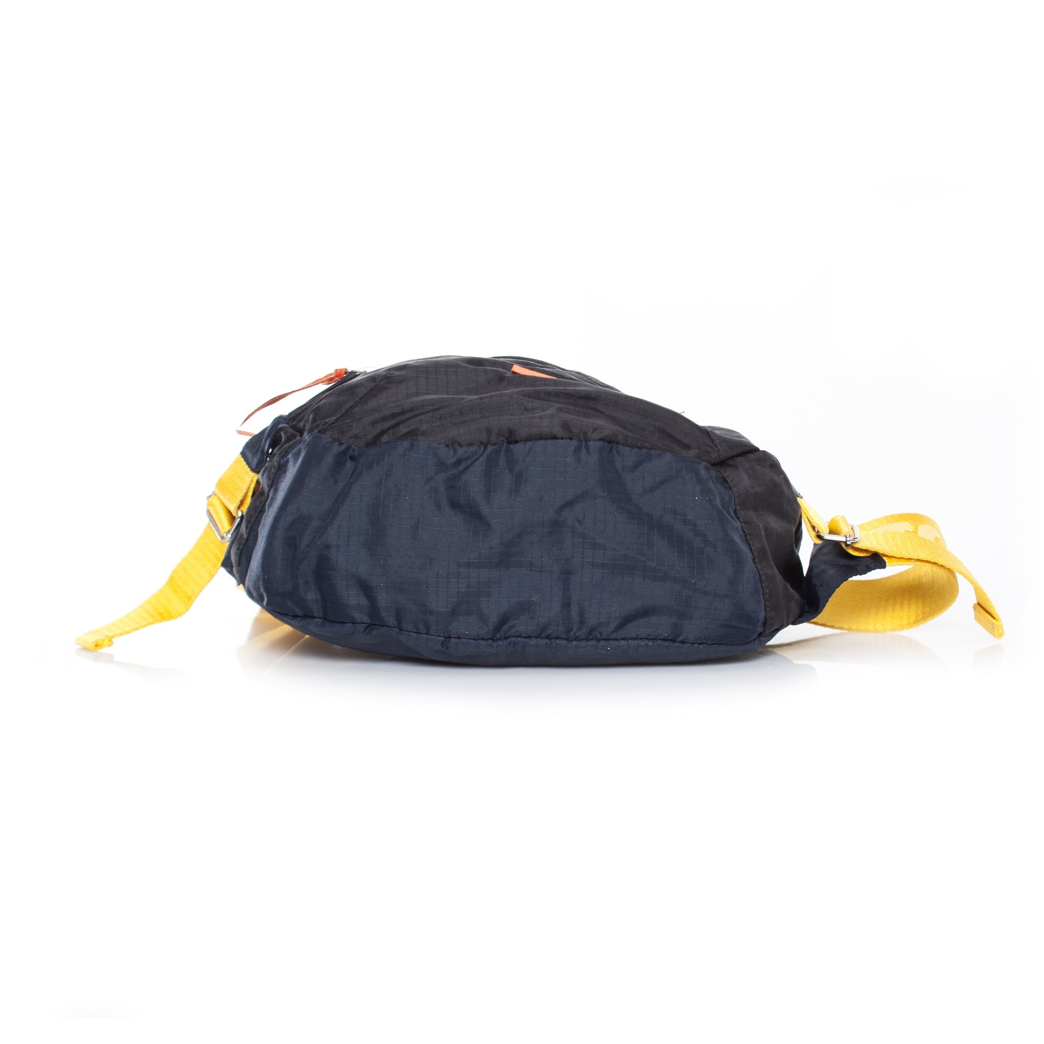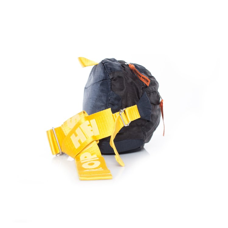 Navy en zwarte heuptas van Heron Preston. Ritssluiting. Oranje met witte rubberen patch met logo en ritsvak aan de voorzijde. Gele, verstelbare riem. Binnenzak met ritssluiting. Zilverkleurige metalen hardware.