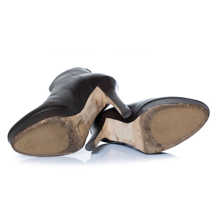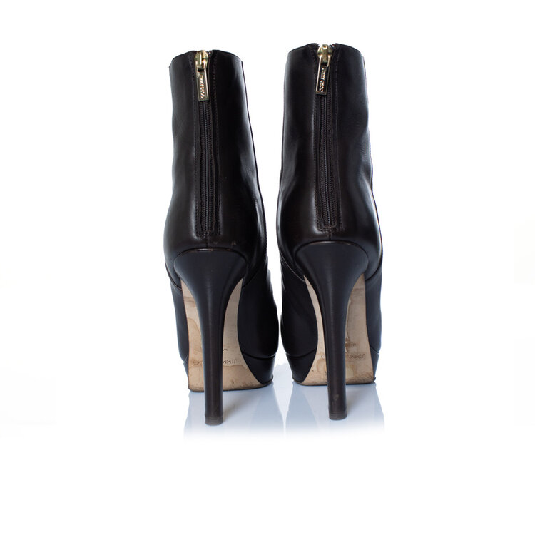 • Jimmy Choo, donkerbruine leren plateaulaarzen. Het artikel heeft krassen op de neuzen en hiel. Wordt geleverd met doos.