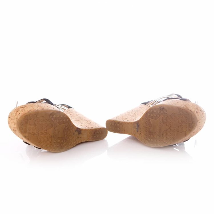 Jimmy Choo, sleehak met zwart/goud leren en suede bandjes en kurkzool in maat 39.