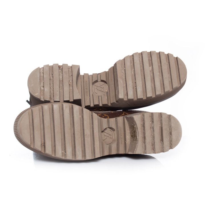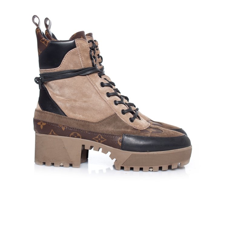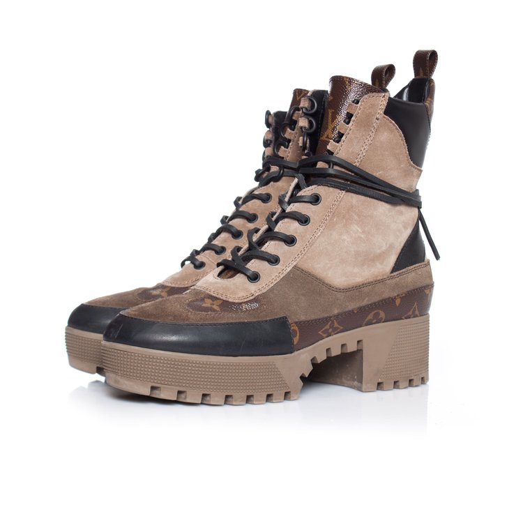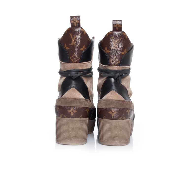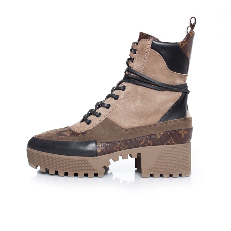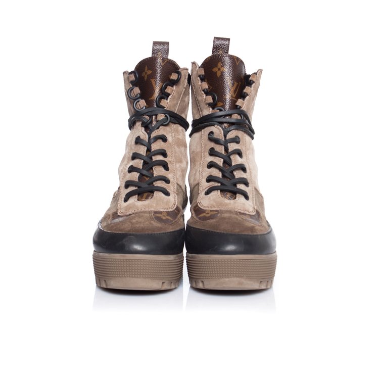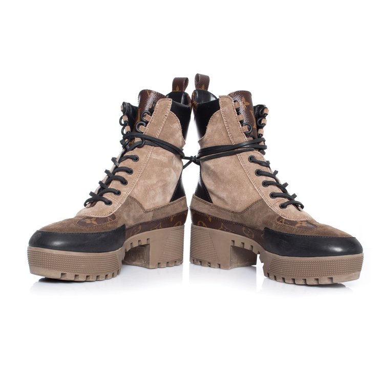• Louis Vuitton, Laureate platform woestijn laarzen in beige. Dit stuk heeft een paar kleine krasjes op de neus verder is het item in zeer goede staat.