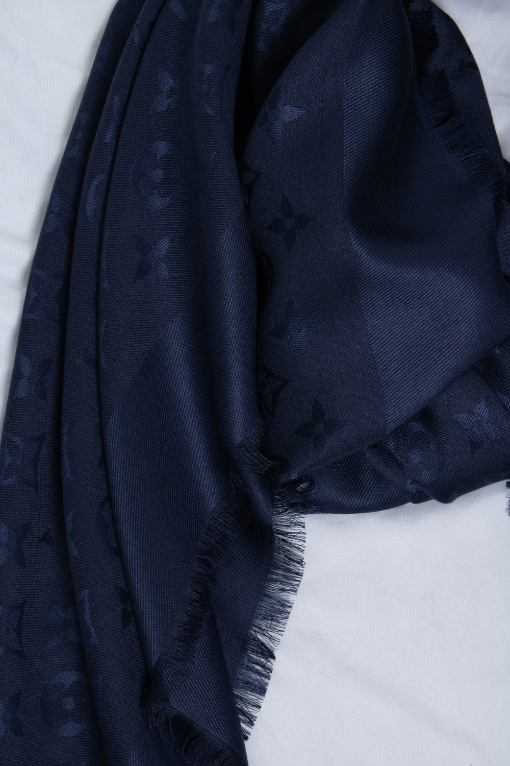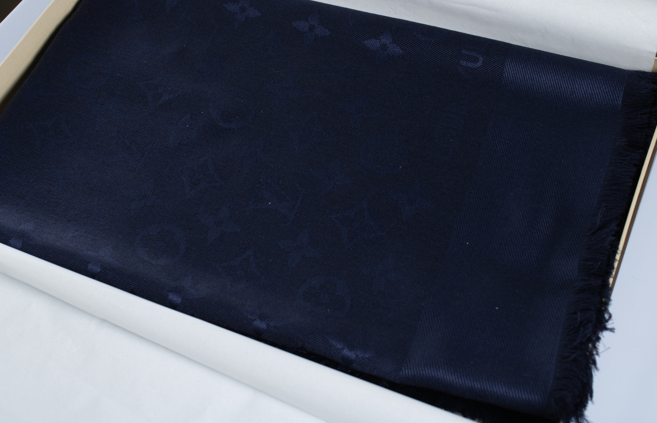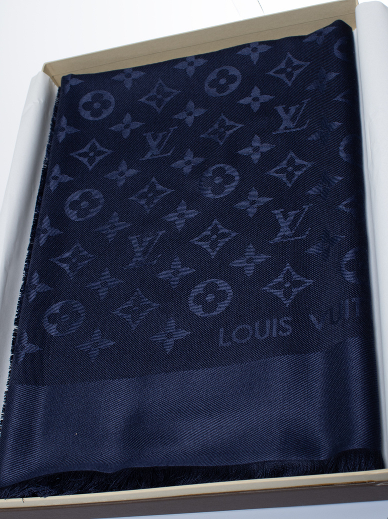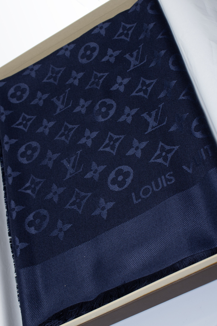 • Louis Vuitton, Monogram sjaal in marineblauw. Het artikel is nieuw in de doos.