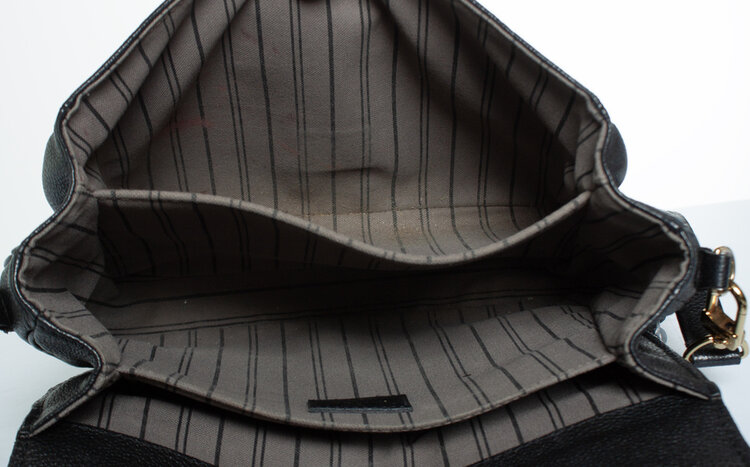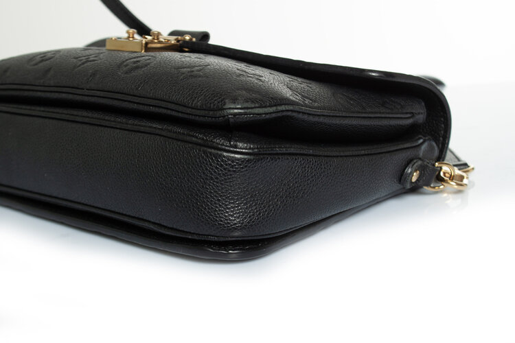 • Louis Vuitton, Pochette Métis Empreinte in zwart. De hoeken zijn wat versleten, de randverf op de handvatten is iets vervaagd. Kleine krasjes op de hardware en verkleuring.