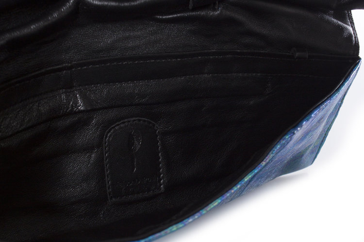 • Maison Du Posh, Blauwe struisvogel leren clutch met doodshoofd ring met doornen. Het item is nieuw - ongedragen. Het leer heeft een olie effect wat veranderd van roze, paars en blauw.