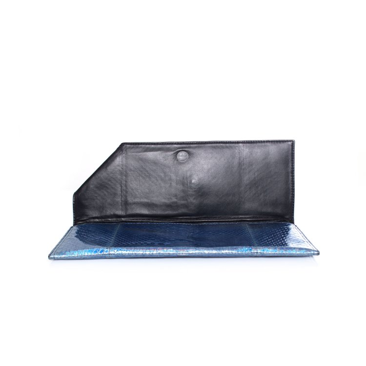 Deze prachtige knokkel ring clutch van Maison Du Posh is gemaakt van blauw metallic gecoat slangenleer met een gold plated schedelring en een spijker die de linker flap hoek verfraait. De tas heeft een magnetische klep sluiting en het interieur is volledig gevoerd met zacht zwart leer en heeft een opbergvak aan de binnenkant.