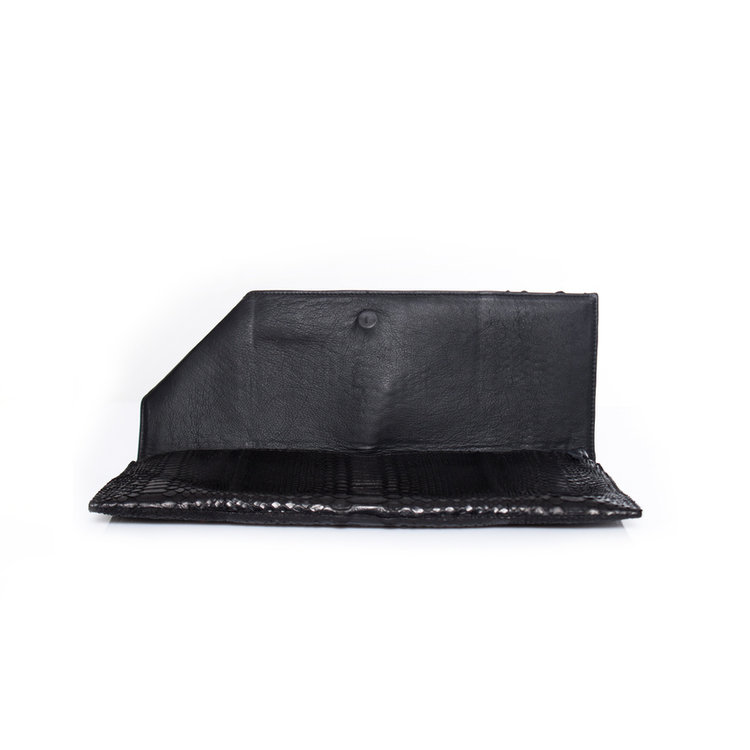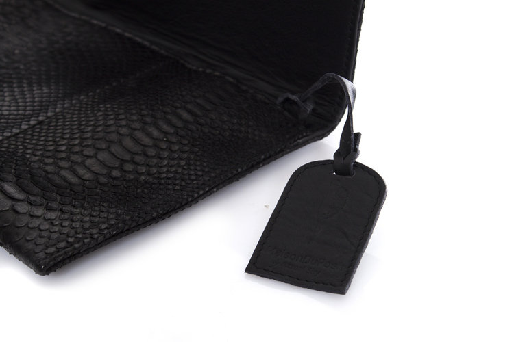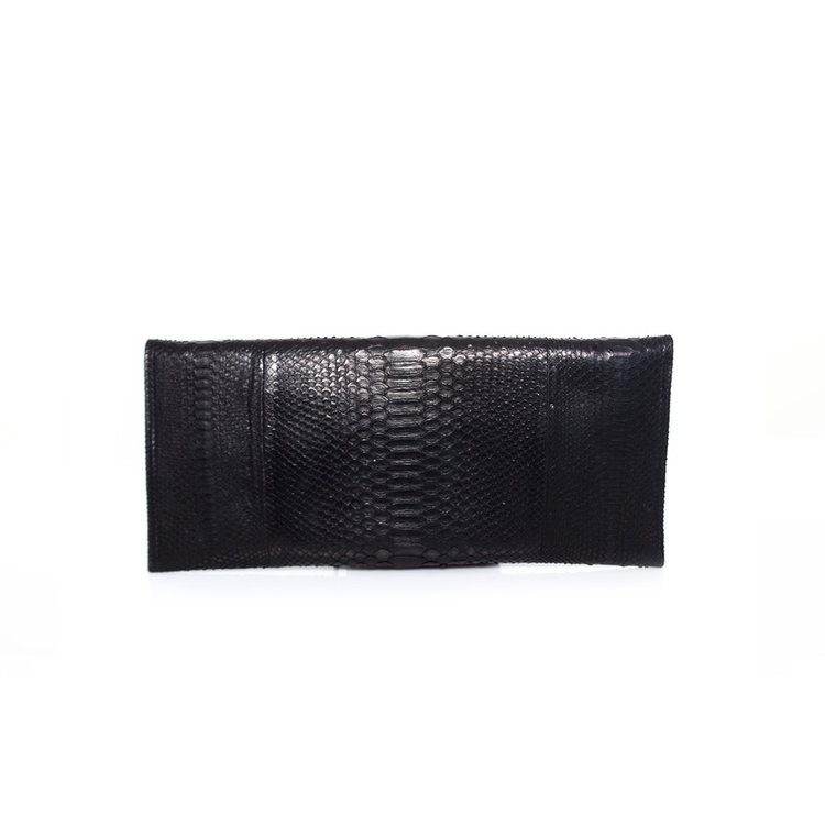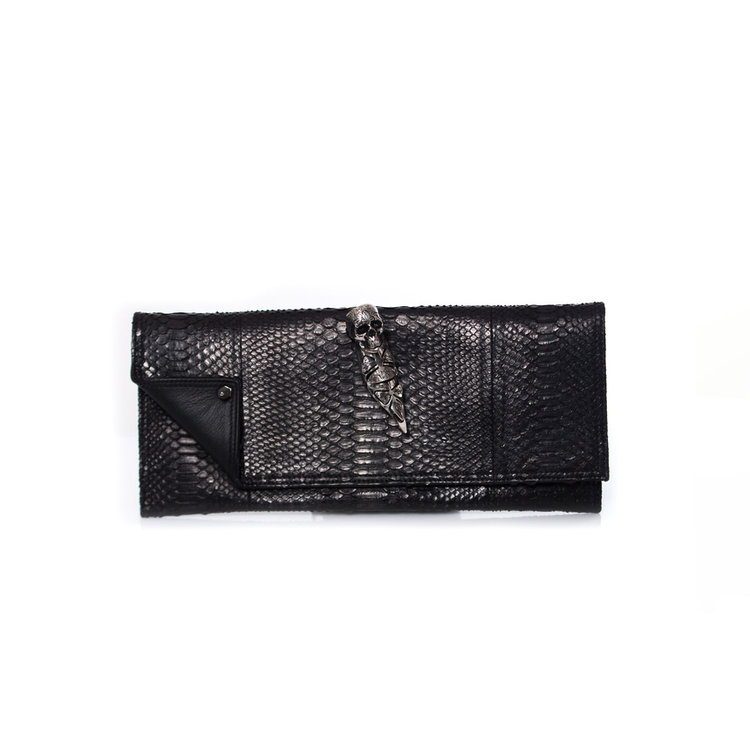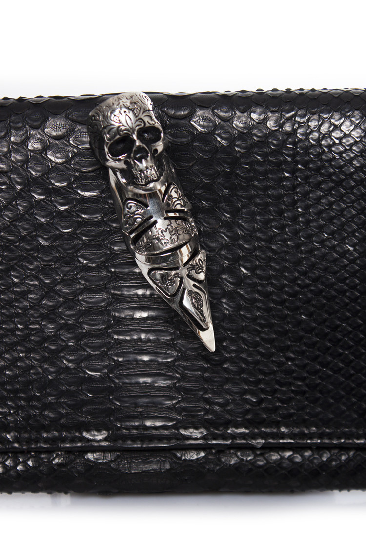Deze prachtige Knuckle Ring Clutch van Maison Du Posh is vervaardigd in zwarte pythonhuid met een zilveren schedelring en een spijker die de linker flaphoek verfraait. Deze clutch heeft een magnetische klepsluiting en het interieur is volledig gevoerd met zacht zwart leer en heeft een opbergvak aan de binnenkant.