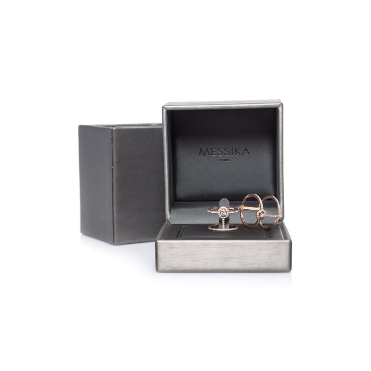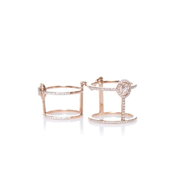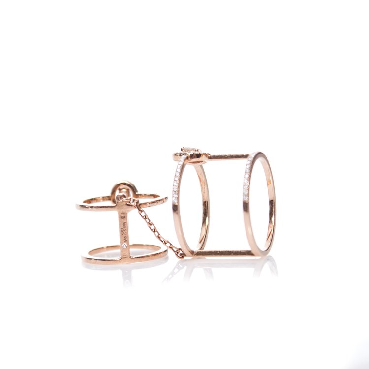 Betoverend. De Glam'Azone-ringen spelen met de contrasten. Een opengewerkte structuur in 18 karaat roze goud voor een luchtig juweel. Een ovaal geslepen centrale diamant versterkt door een diamant gezet entourage. In deze dubbele pavé-versie bevat de Glam'Azone-ring twee ringen: één om op het gebruikelijke deel van de vinger te dragen en de andere bovenop de tweede vingerkoot. Een sensueel en elegant diamantjuweel dat de vinger opmaakt in lijn met die zo trendy neo-juwelen. Dankzij het slimme afneembare kettingsysteem kunnen meerdere manieren van dragen worden gedurfd: op de wijsvinger, op de ring, op de middelvinger ... Roze gouden ringen zijn absoluut trendy. De originaliteit, zachtheid en poëzie maken roze goud tot een succes. Het is vaak de beste wisselwerking tussen een juweel in geelgoud en een witgoud juweel. De twee ringen kunnen samen of afzonderlijk worden gedragen. Een diamantjuweel, eveneens de vrouw van vandaag, vrij, met meerdere aspecten.