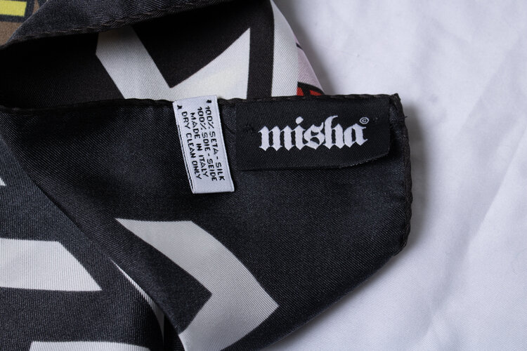 • Misha, Vierkante sjaal met grafische print (1 van 3). Het artikel verkeert in zeer goede staat en wordt geleverd met doos en authenticiteitsbewijs.