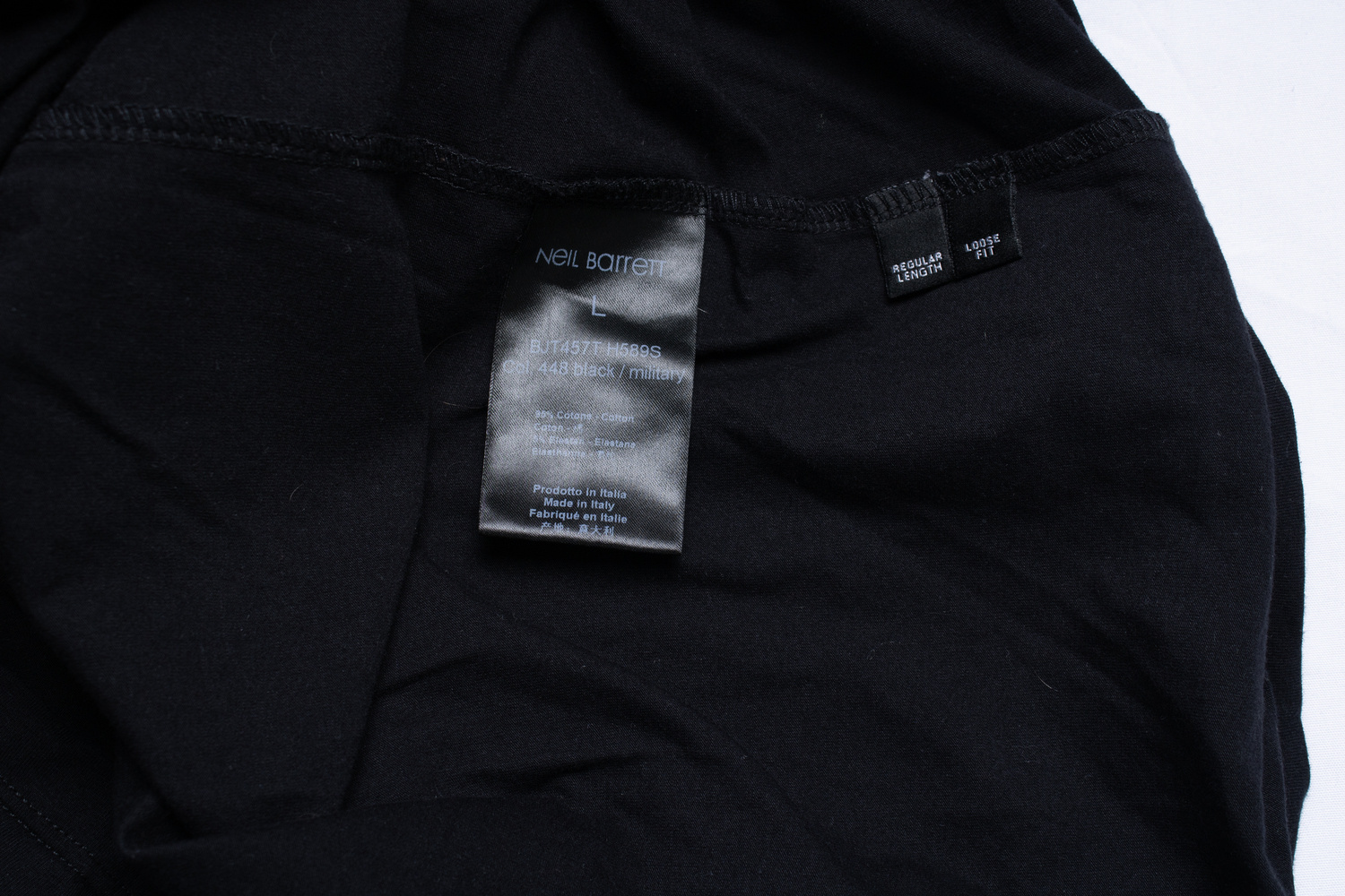 • Neil Barret, T-shirt met bliksemprint in groene camouflage. Het artikel verkeert in goede staat.