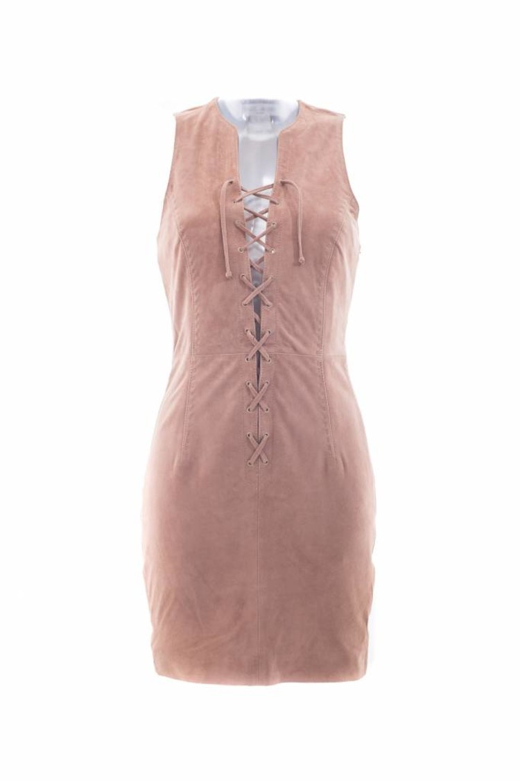 Paul & Joe, beige kleurige suède jurk met veter sluiting aan de voorzijde. Het product is helemaal nieuw en nooit gedragen. Combineer en draag hierbij over de knie laarzen met blokhak en rechte schacht in dezelfde kleur beige.