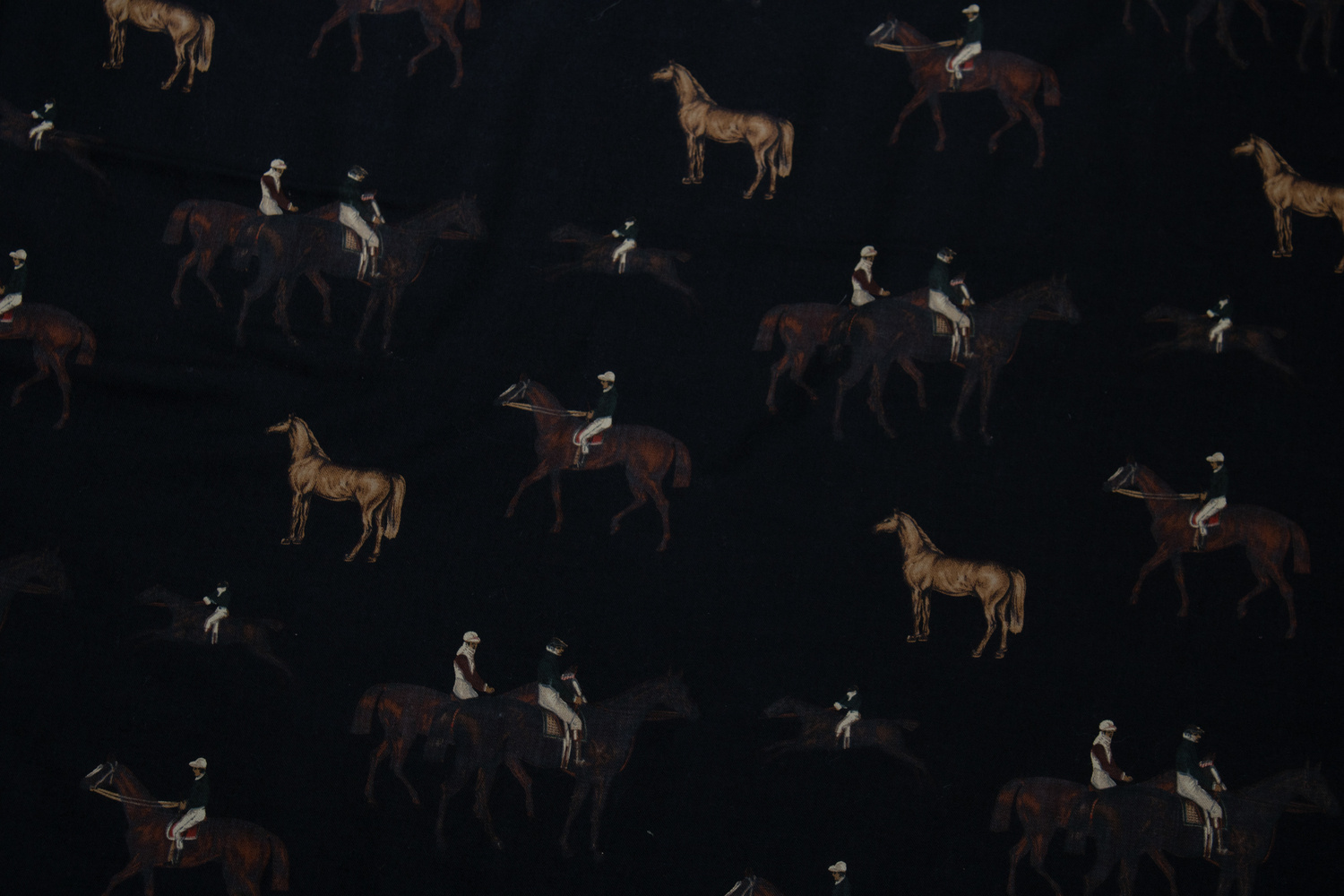 • Pauw, geruite sjaal met paardenprint. Het artikel is in goede staat. Klein gaatje in de stof.