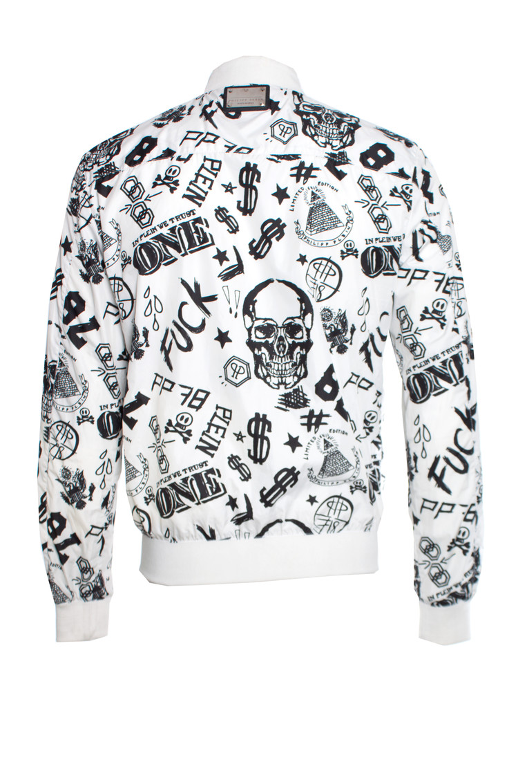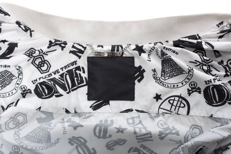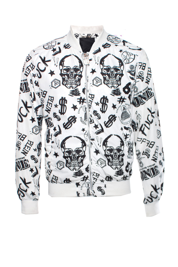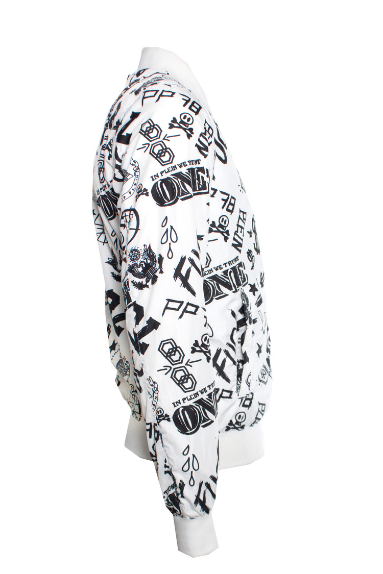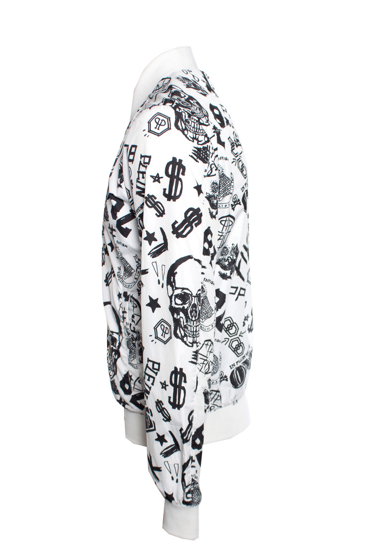 Philipp plein witte bomber met zwarte dollar/schedel/tekst schetsen in maat L.