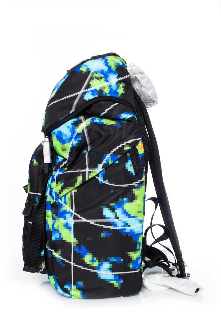 Prada nylon rugzak met radarprint, één voorvak en twee zijzakken met ritssluiting. Driehoeklogo opzij, gewatteerde achterkant en verstelbare schouderbanden. De rugzak heeft een trekkoordsluiting en twee gespen op de flap, saffiano handvat en naamplaatje. Het heeft ook een nylon voering en twee binnenzakken. Samenstelling: 100% nylon