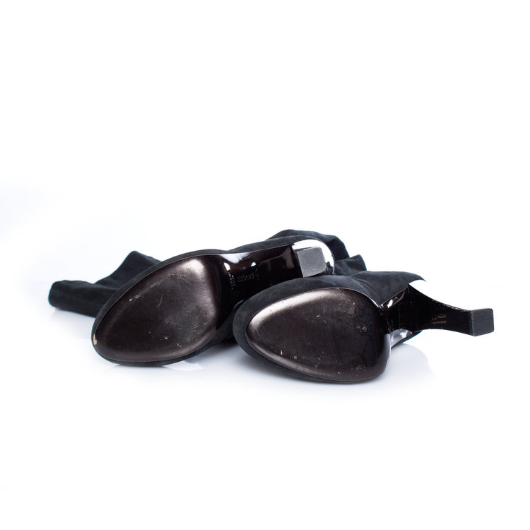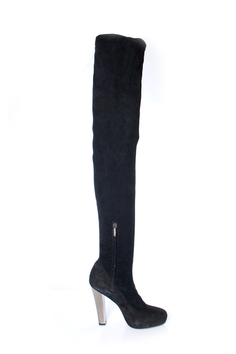Roberto Cavalli, zwarte suède dij-hoge laarzen met gespiegelde hakken in maat 40.5.
