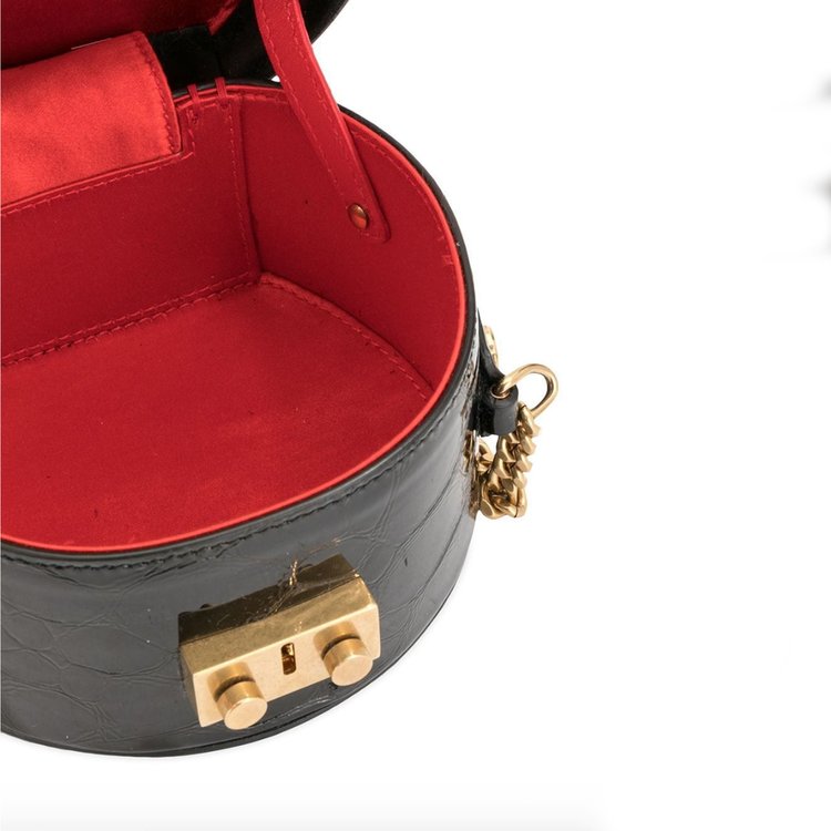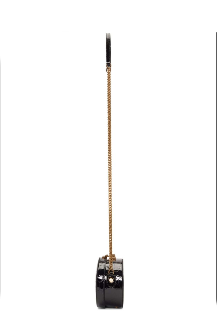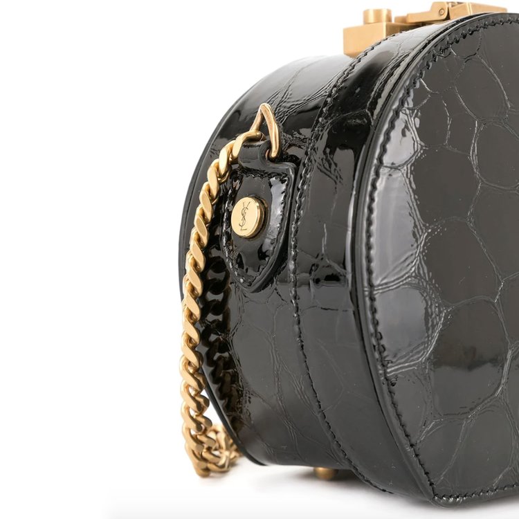 Saint Laurent, Mica B minitas in lakleer. Beschikt over een reliëf krokodileffect, een ritssluiting bovenaan, een reliëflogo, een gespsluiting bovenaan, een interne logopatch en een schouderband in goudkleurige ketting.