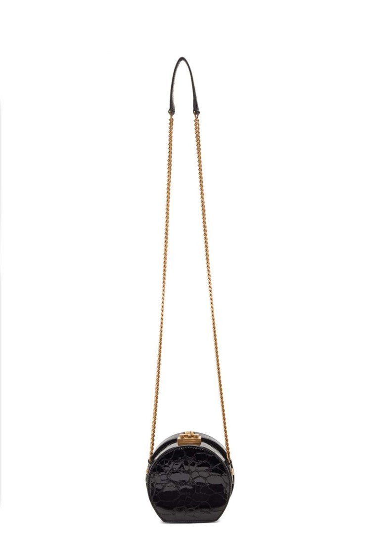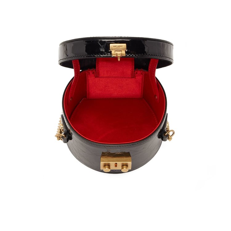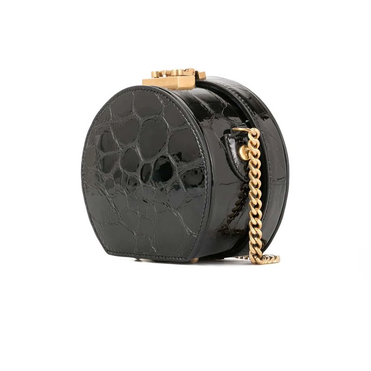 • Saint Laurent, Mica B minitas in lakleer. Beschikt over een reliëf krokodileffect, een ritssluiting bovenaan, een reliëflogo, een gespsluiting bovenaan, een interne logopatch en een schouderband in goudkleurige ketting.