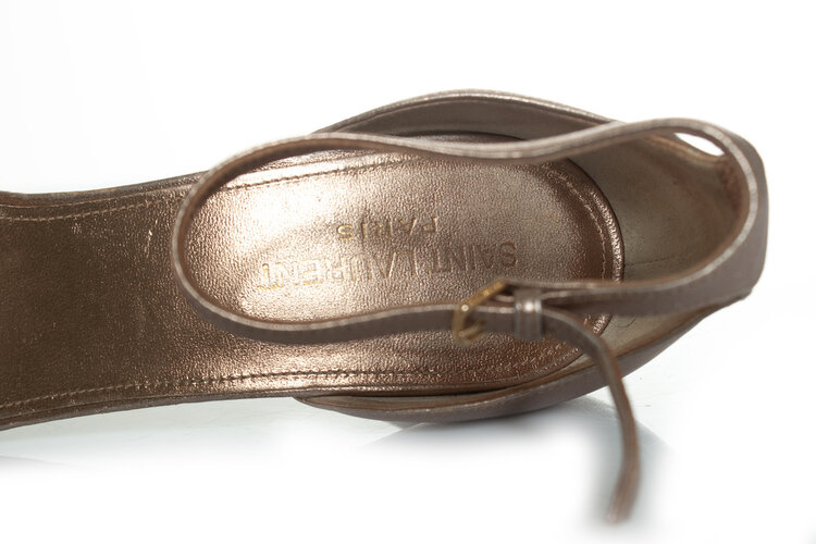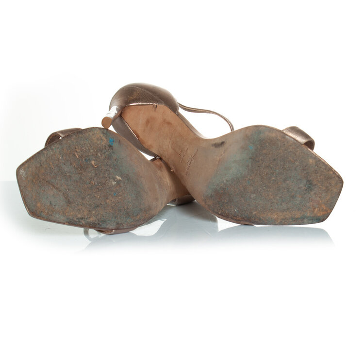 • Saint Laurent, metallic sandalen. Het item heeft krassen op het leer en de hakken zijn voorzien van een plastic omhulsel