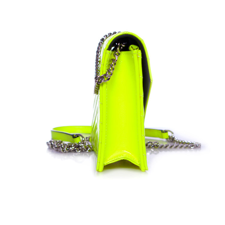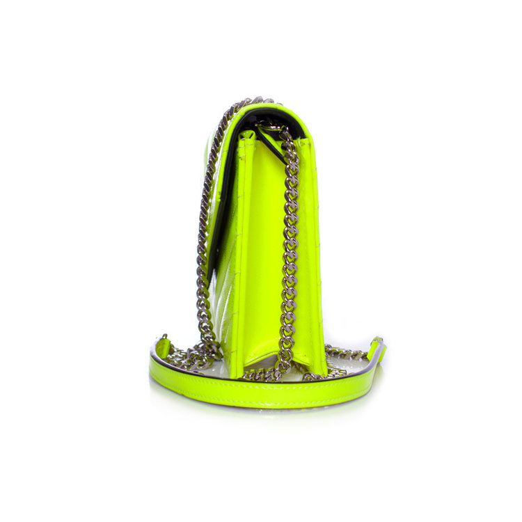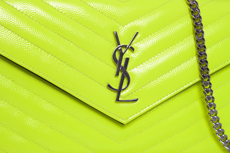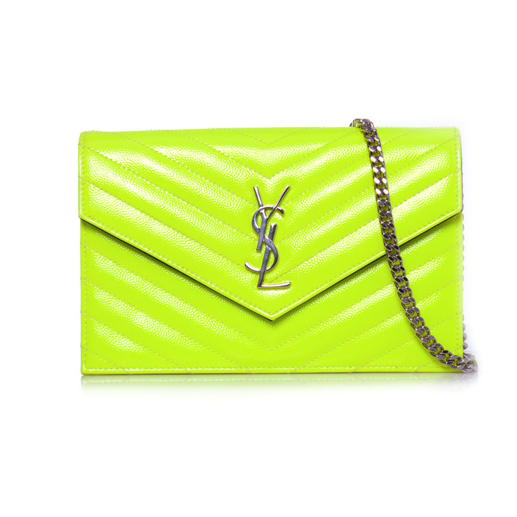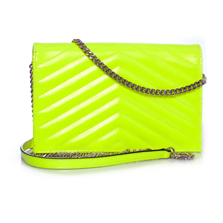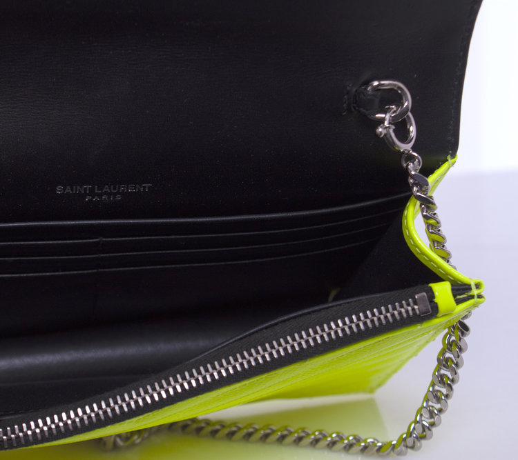 • Saint Laurent, wallet on chain in neon geel met zilveren hardware. Dit artikel is in uitstekende staat.