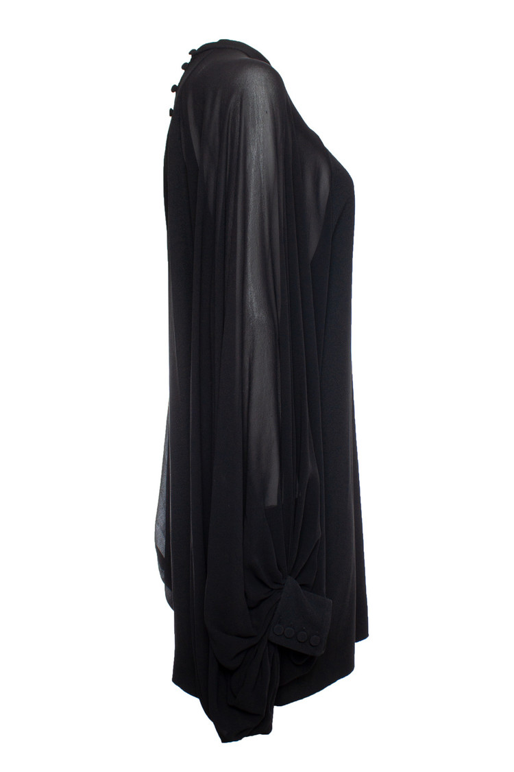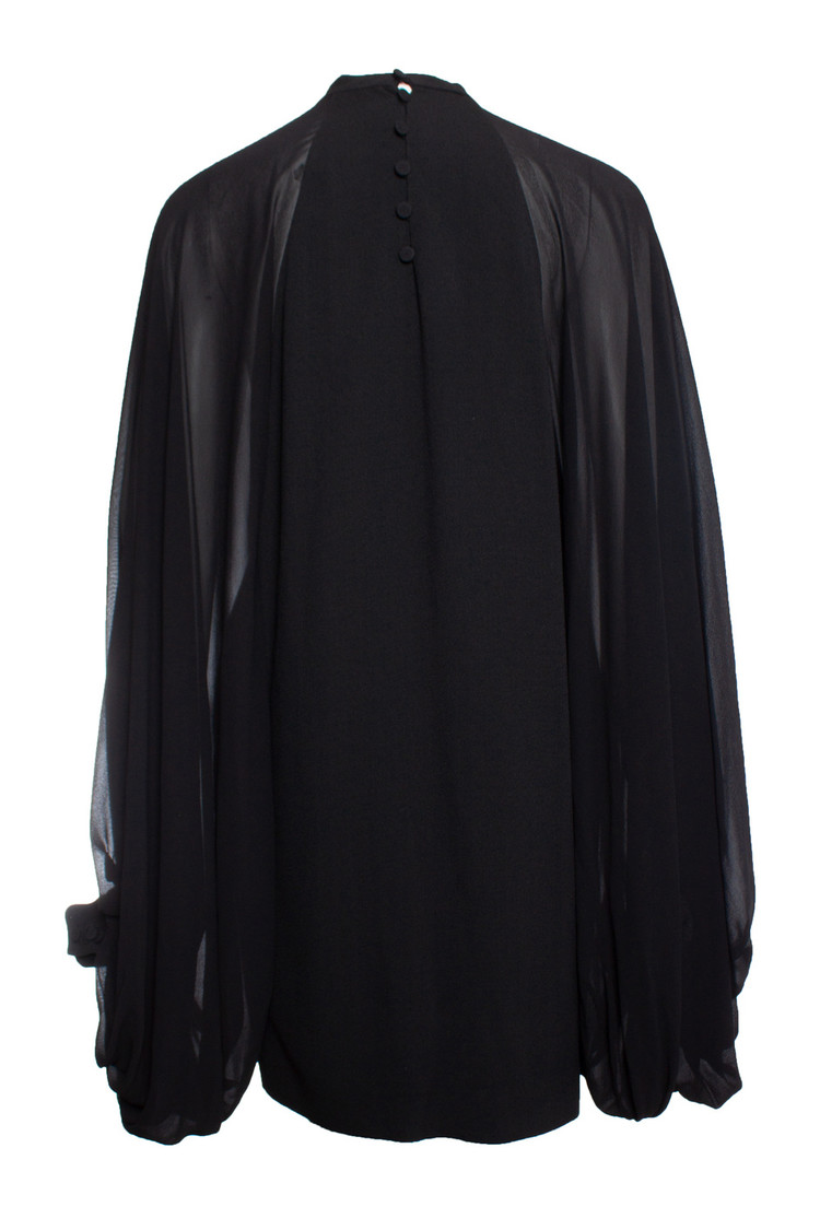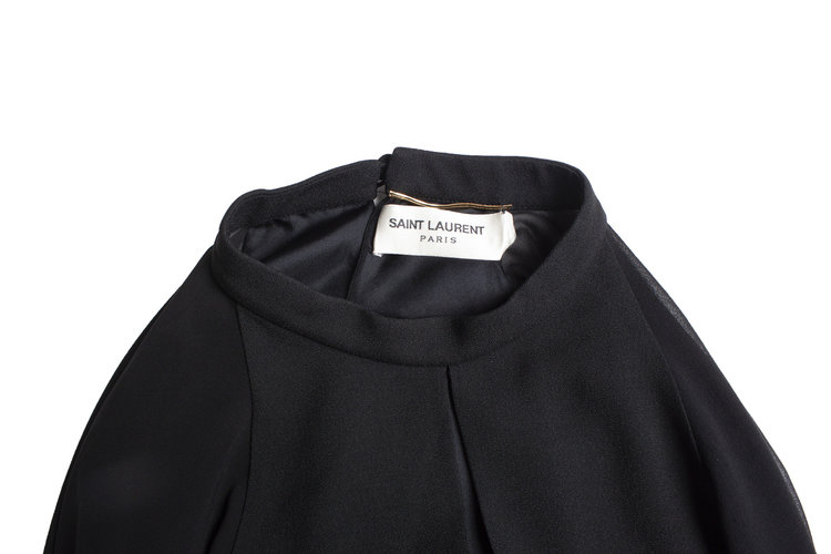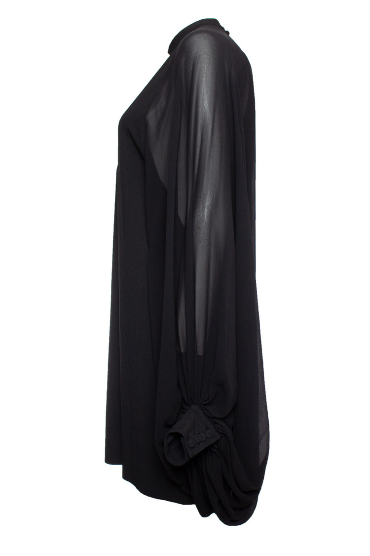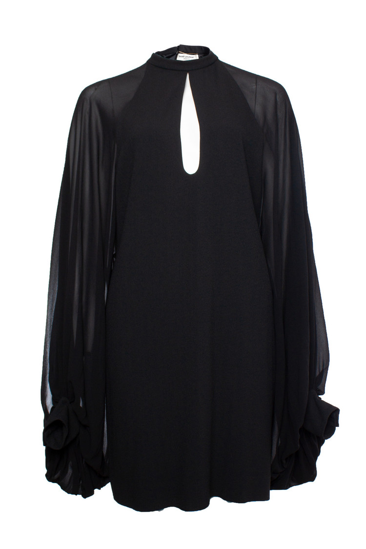 • Saint Laurent, zwarte jurk met transparante pof mouwen en open decollete. Het item verkeert in zeer goede staat.