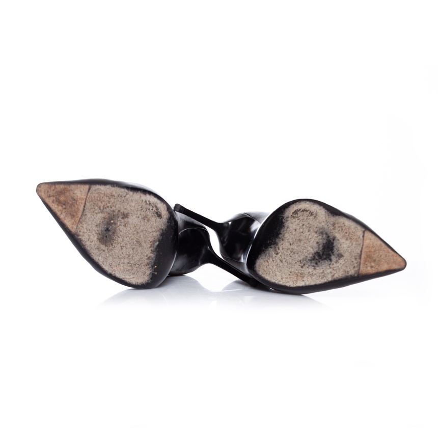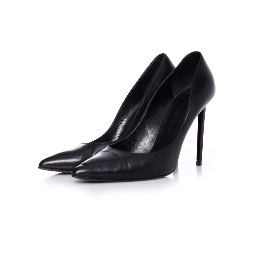 • Saint Laurent, zwarte leren pumps. Het item heeft wat krasjes op beide hielen en wat kreukels op de neus van de schoen verder in goede staat.