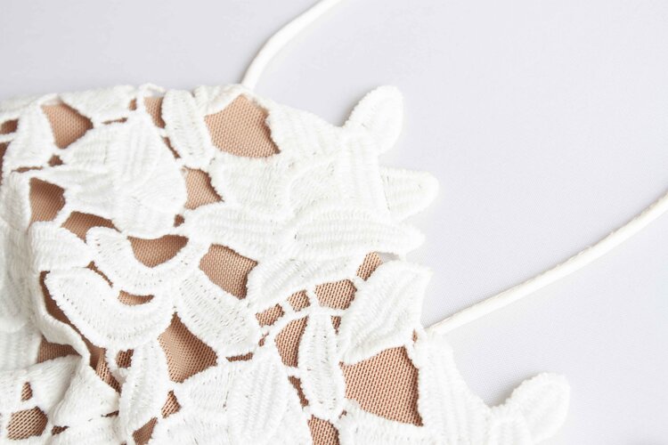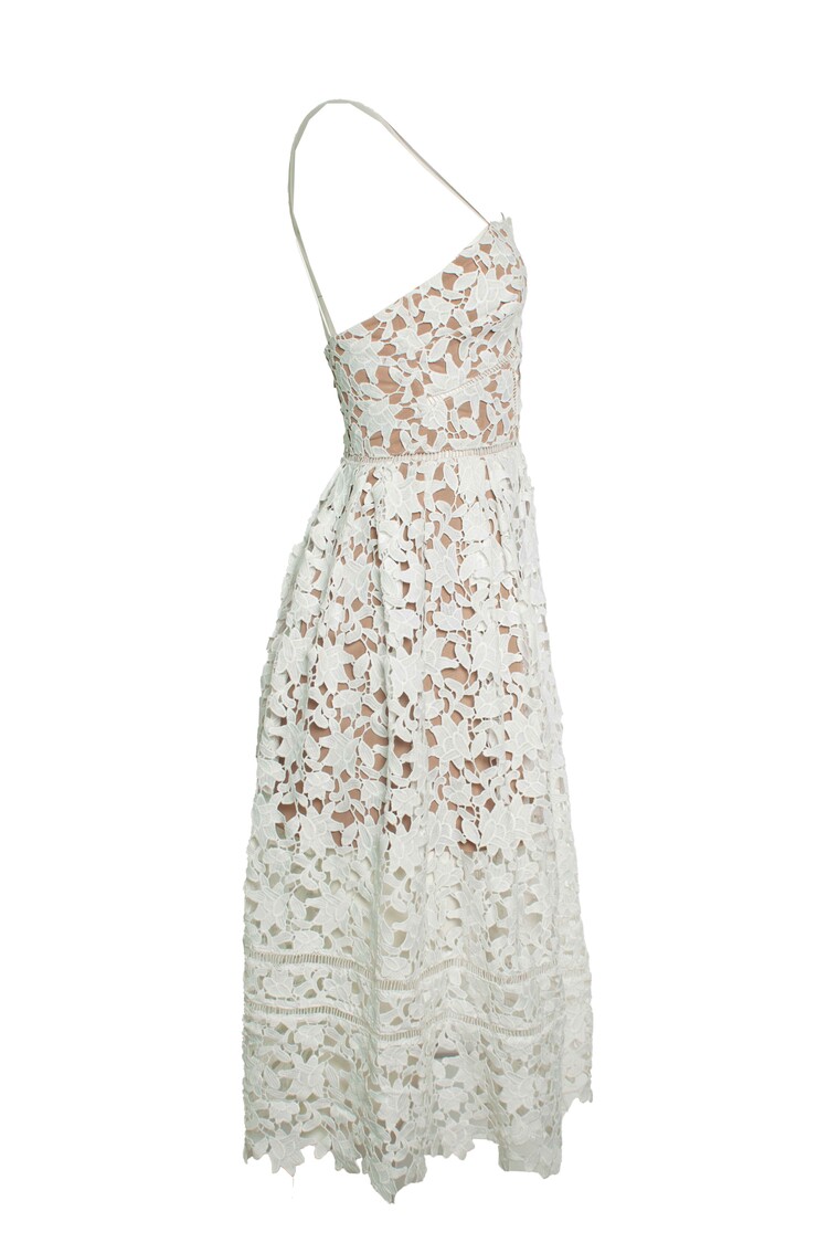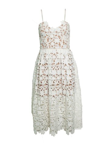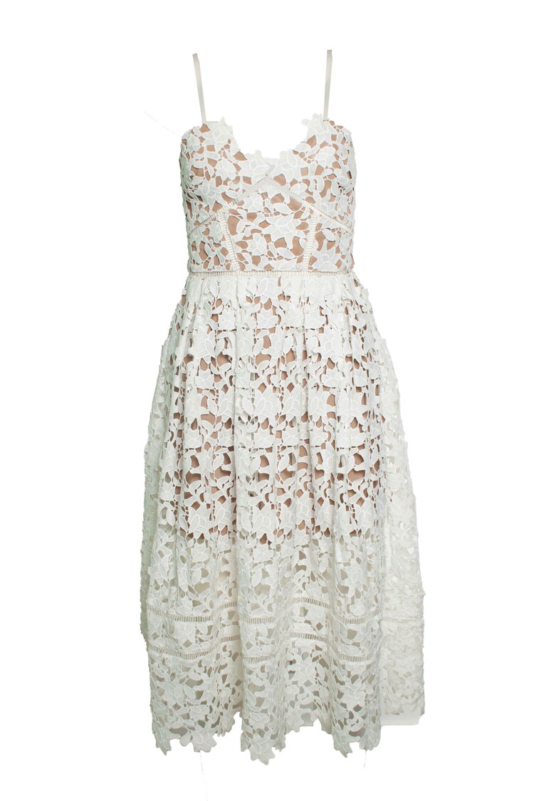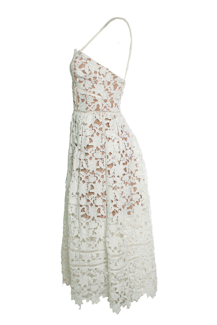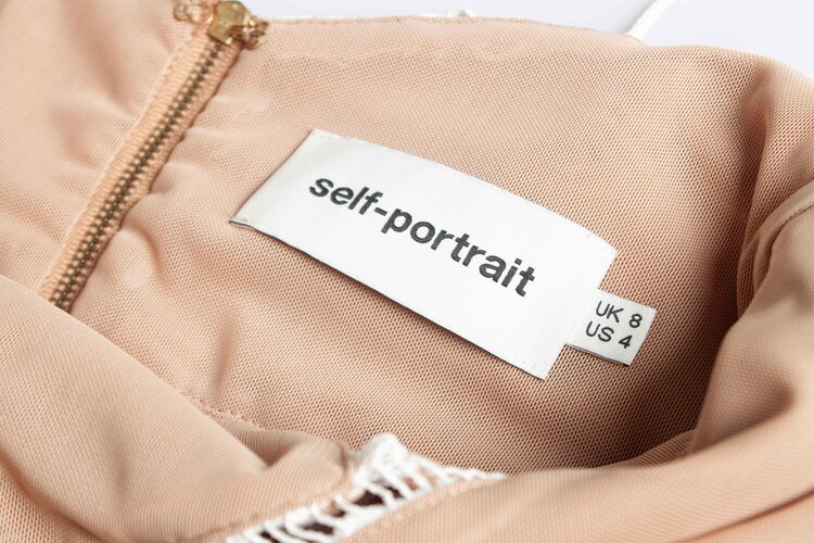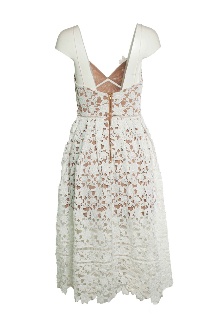 Self-Portrait, witte azaelea jurk. Het item heeft lichte verkleuring aan de binnenkant van de bandjes en 2 hele kleine vlekjes aan de voorkant, verder in zeer goede staat.