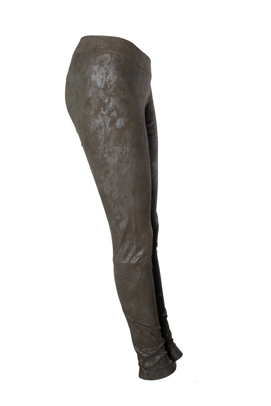• Sylvie Schimmel, suède gecoate legging in taupe. Het artikel verkeert in zeer goede staat.
