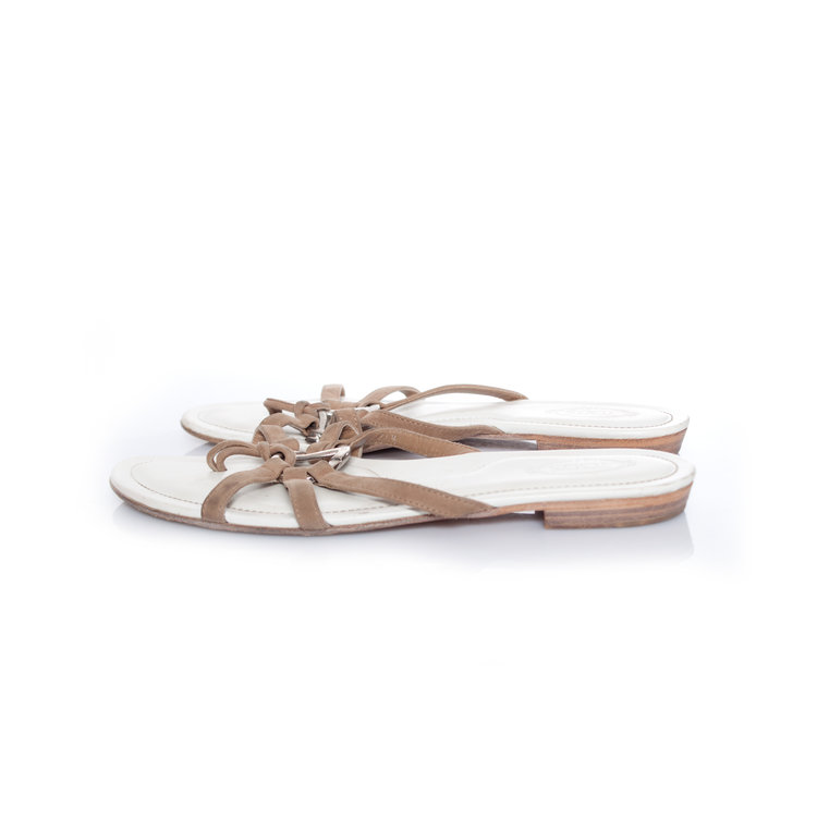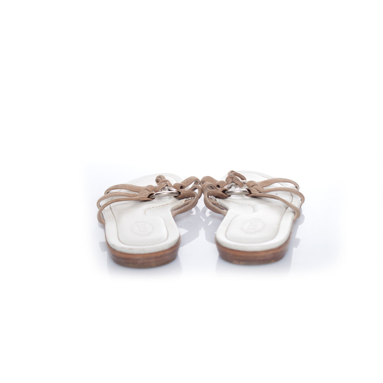 Tods, zandkleurige suede sandalen met zilver metaalwerk in maat 40.5. Het item is gedragen en heeft wat lichte gebruikerssporen maar is in goede conditie.
