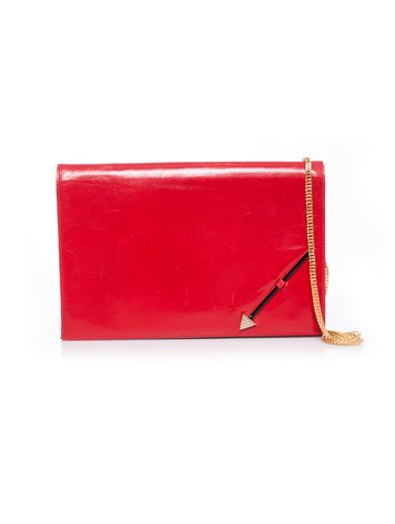 Valentino, Vintage rode hoogglans leren schoudertas met pijl. Dit stuk heeft wat lichte krasjes op het leer en de magneetsluiting is kapot. Voorzien van een zijvak met ritssluiting aan de binnenkant. Interieur is erg netjes. Overal in goede staat met wat