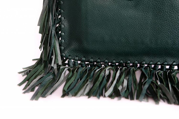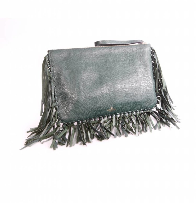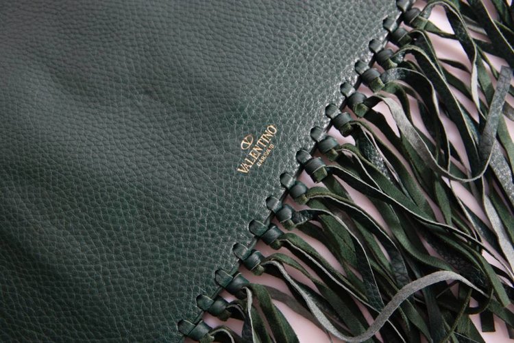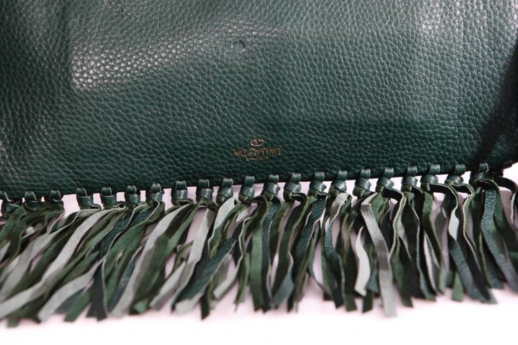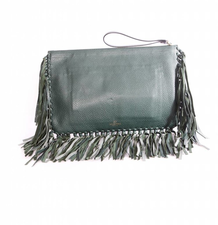 • Valentino Garavani, groen leren clutch tas met franjes en gouden metaal. Het product is in top conditie en maar één keer gebruikt, wordt geleverd met officiële certificaat en originele stoftas.