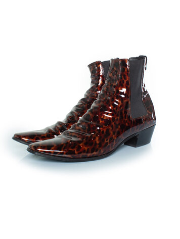 Saint Laurent, Dylan Chelsea enkellaarzen met schildpadprint en lakleer. Het artikel heeft gerimpelde neusjes en verkeert in goede staat.