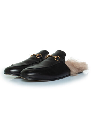 Gucci, leren Princetown loafer met bont in zwart. Het artikel verkeert in zeer goede staat. Er zitten kleine vlekjes op het leer. Wordt geleverd met doos en stofzakken.