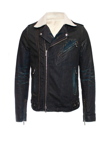Balmain, vuilblauw gewassen biker jack met schapenvacht. Dit artikel is weinig gedragen en verkeert in zeer goede staat. Het item heeft een verweerde look en is afgewerkt met zilveren hardware.
