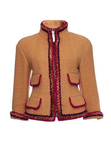 Chanel, camel kleurig wol jasje met gekleurd gevlochten rand. Het item heeft 4 zakjes op de taille, en ritsen die van beide kanten geopend kunnen worden. Het item verkeert in een zeer goede staat.
