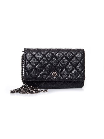 Chanel, Gewatteerde WOC-clutch van gecraqueleerd lakleer in zwart met zilveren hardware. Binnenkant heeft meerdere kaartsleuven en een vak met ritssluiting. Buitenleer is in goede staat. Randen hebben rondom wat slijtage. Interieur is in zeer goede staat.