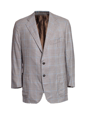 Brioni, blauw geruiten wollen blazer met zijde. Het item verkeert in een goede staat. Heeft 2 bleekvlekjes in de voering en een vlekje die net onder de kraag valt.