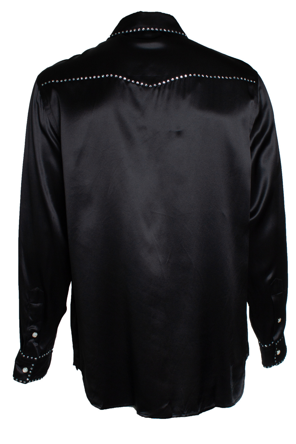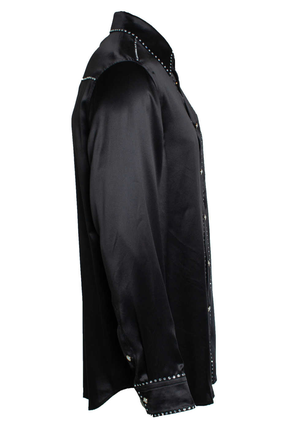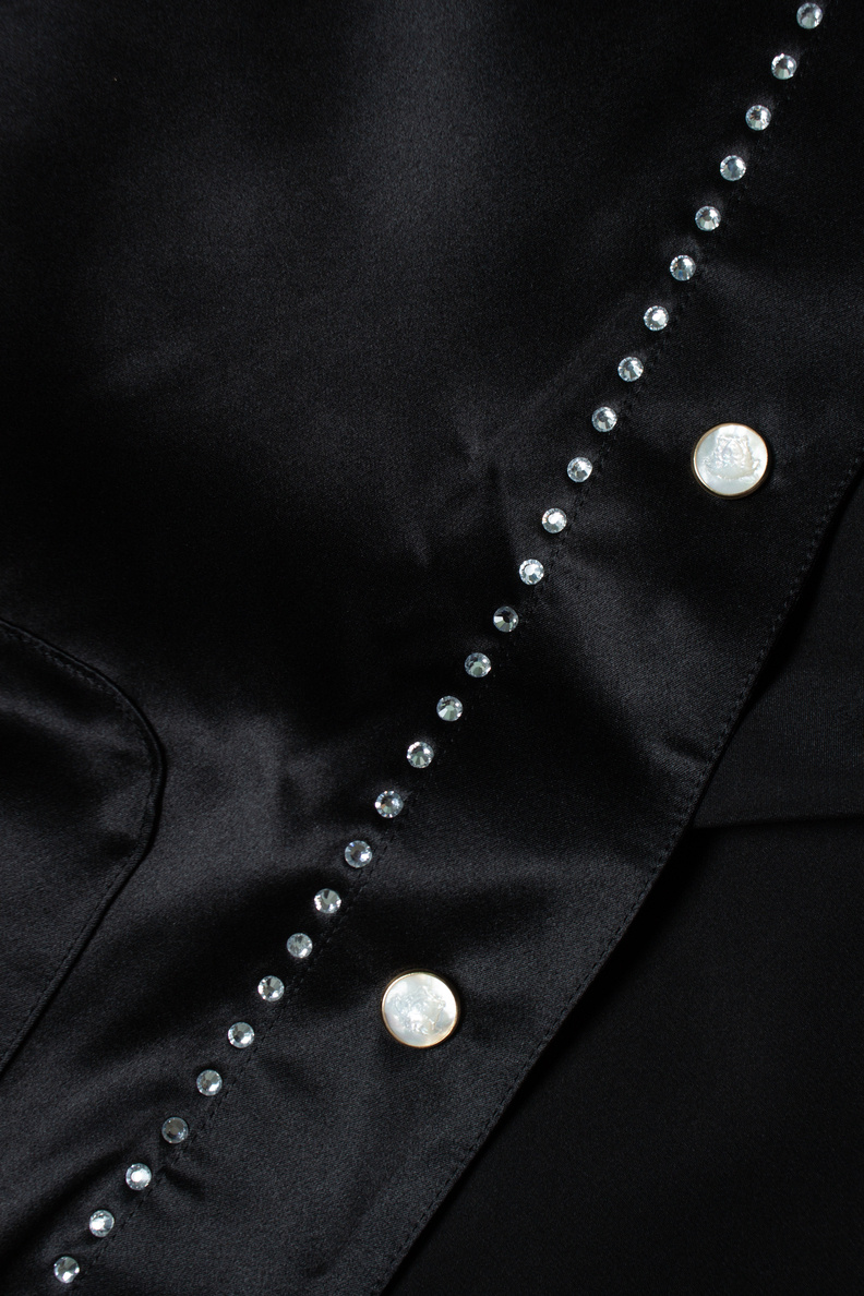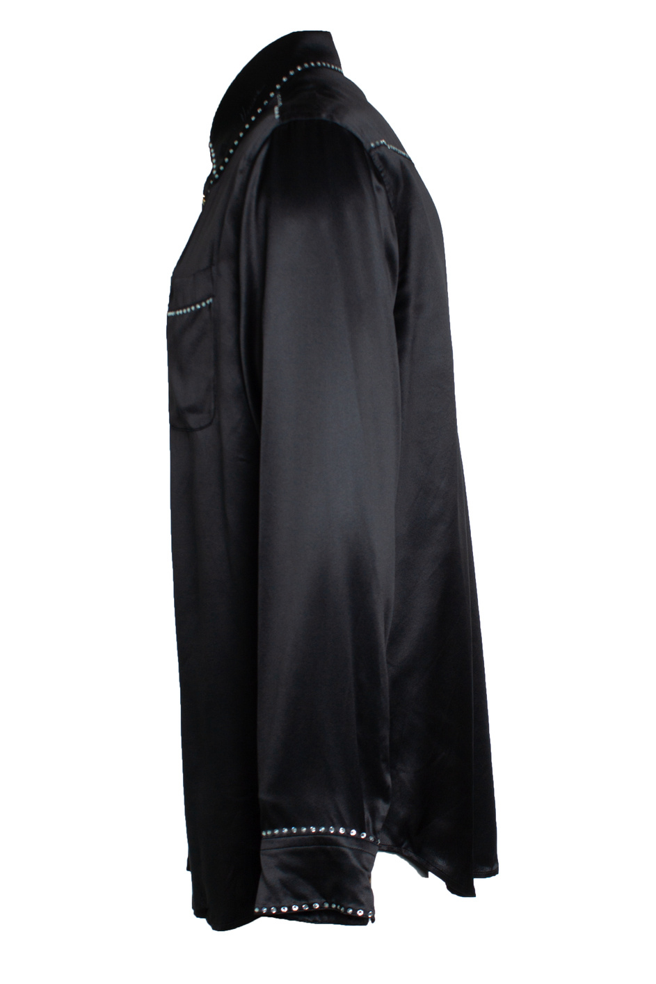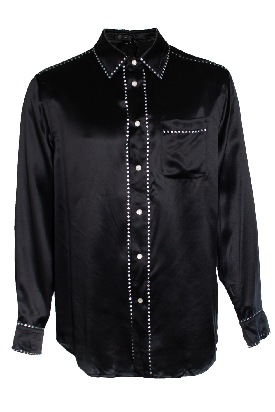 • Versace, zwart satijnen shirt met strass steentjes. Het artikel is nieuw met label.