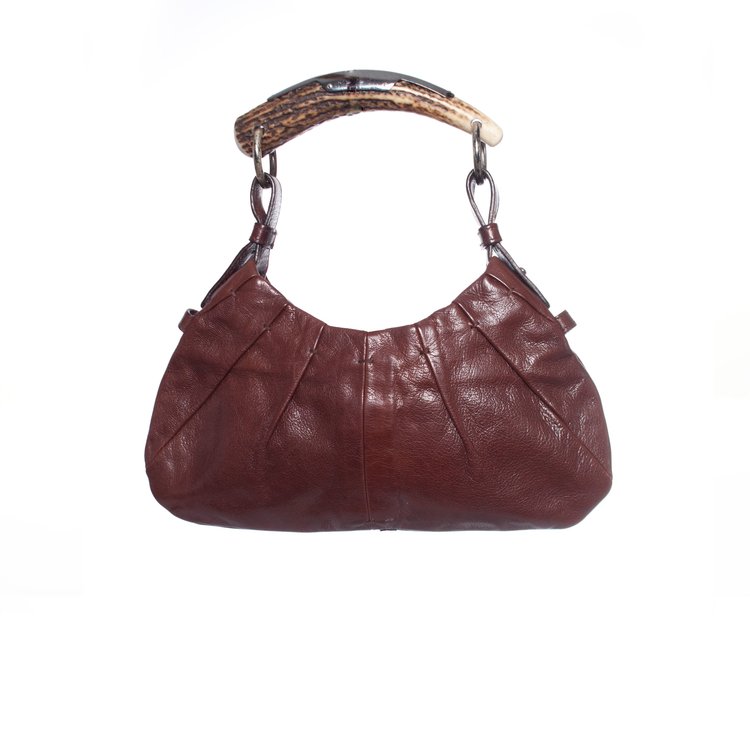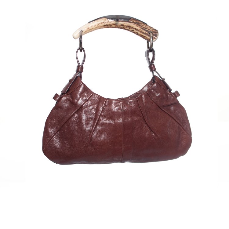 Yves Saint Laurent, bruine mini Mombasa leren handtas. Dit item heeft een zilverkleurige hardware, een handvat van hoorn, een magnetische sluiting en een suède binnenkant met een vak met rits. Het item is in goede staat en wordt geleverd met stofzak.